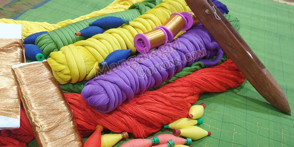 Once we process the warp, we fix this to loom and start weaving process. At this point we also attach zari threads to warp to make zari boarders on Mangalagiri sarees. In general, a weaver can weave a Mangalagiri Saree in 1-2 days. The weaving time may vary based on the saree design.